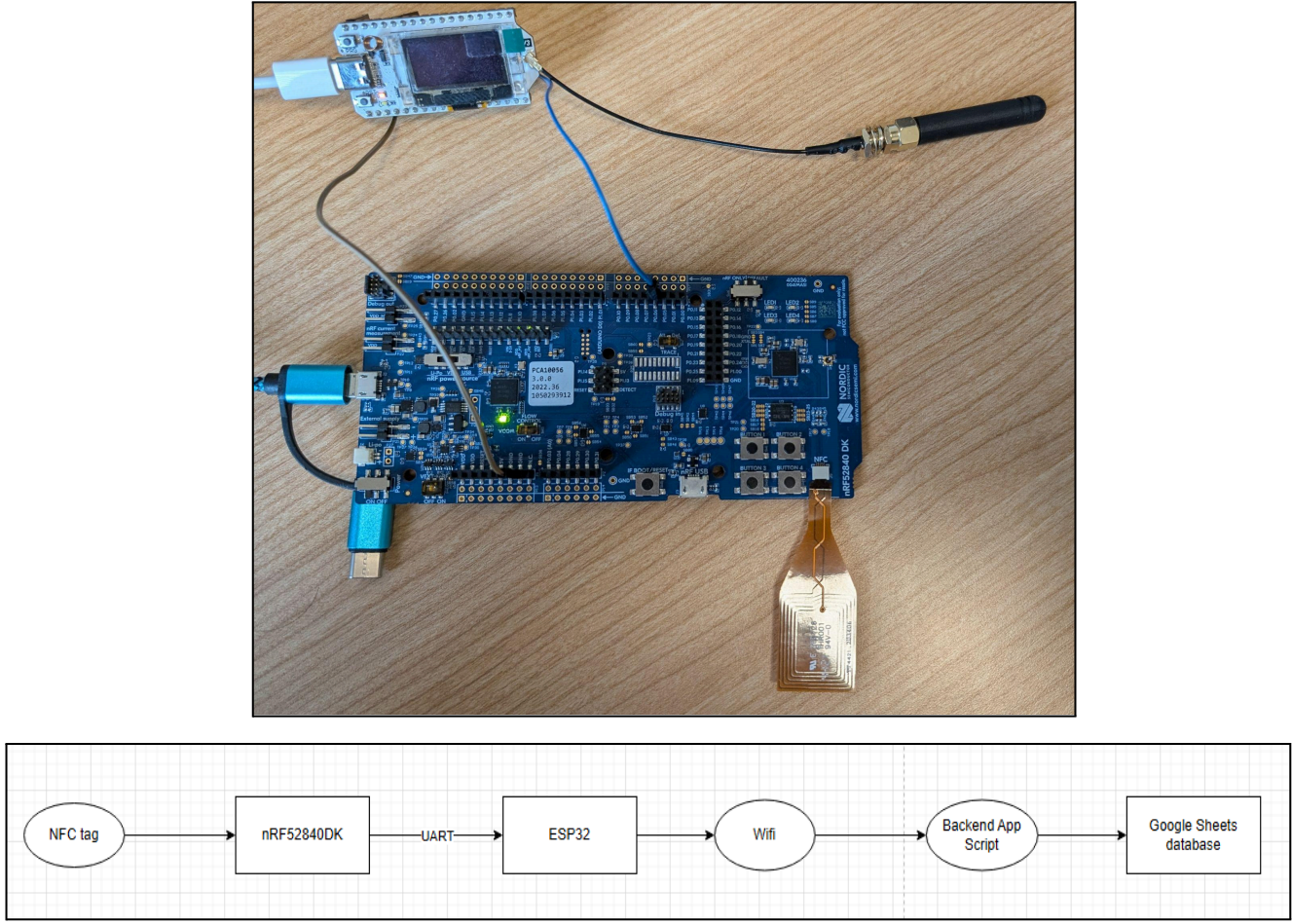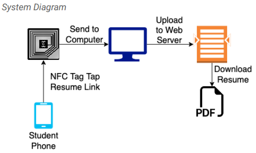 In a world where paper is out of date, resumes are difficult to quickly and easily distribute at career fairs and networking events. Most recruiters are left with piles of paper resumes, and those that choose to collect information electronically require students to complete a lengthy form when most students would prefer to spend their time networking with professionals. Our technology aims to solve this problem with an efficient, paperless solution. With our system, students can seamlessly tap their phone to the recruiter’s NFC tag and deliver their resume. Students create a link that corresponds to their resume PDF and embed it as a URL record via the NFC Tools app. The recruiter possesses an nRF52840DK board with a Type 4 NFC tag that is programmed to be writable and is actively running. The student then taps their phone to the NFC tag. An NRF Connect application flashes the student’s resume to the tag, and a python script running in the background parses the resume’s URL record out of the NFC NDEF message and a script uploads the resume PDF to the recruiter’s web service. This seamless process instantly places the student’s resume on the recruiter’s website for their more thorough review later, after the recruiting fair has completed.