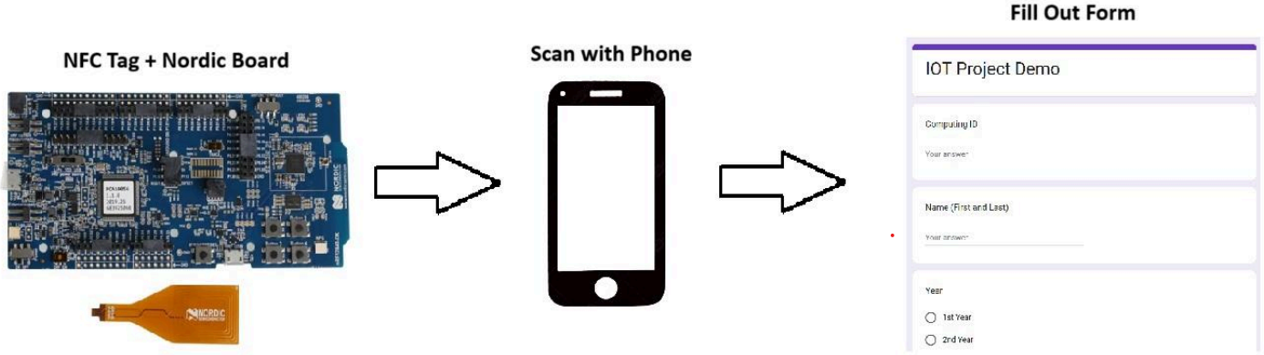 The Center for Diversity in Engineering (CDE) is a student space dedicated to advocating for underrepresented groups in STEM. Currently, it uses an iPad-based survey system for sign-ins. While effective in quieter moments, this setup becomes inefficient during events or meetings when multiple attendees arrive simultaneously. To address this bottleneck, our team developed an NFC-based wireless sign-in system that dramatically reduces friction. Instead of queueing to manually fill out a form, students can now simply tap their NFC-enabled smartphones to an NFC tag at the entrance. This instantly opens a web-based sign-in form, enabling seamless and rapid user check-in. The solution is more accessible, minimizes congestion, and is particularly effective in high-traffic scenarios like meetings or CDE-hosted gatherings. Our system uses a passive NFC tag, programmed with a URI (Uniform Resource Identifier) record that links directly to an online form (e.g., a Google Form). These tags require no power source and activate when tapped by an NFC-compatible smartphone, which reads the stored URL and opens the form in the browser automatically. On the backend, all responses are logged in a connected Google Sheet for easy access and analysis. Additionally, the system is very scalable, meaning multiple tags can be placed around the space. {style=“text-align: justify;”}