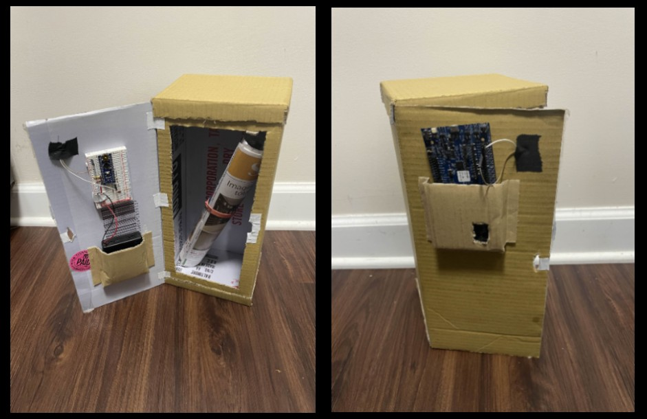 The purpose of this project was to create a wireless solution to infrequent mailbox usage. One of our group members receives mail quite infrequently, thus making it unnecessary to check for mail every single day. This circuit uses a photoresistor to detect when the mailbox is open, which then causes an nrf52840 board to send a bluetooth notification to a mobile device. The main circuit board is placed on the inside of the door which opens and closes. This causes there to be a voltage reading from a voltage divider using the photoresistor to change dynamically with how much light the board receives (i.e. when the door opens and closes). The circuit itself uses an Arduino nano to convert the analog input from the voltage divider into a digital output, which is then read by the nrf52840. If the nrf52840 reads a voltage of over 2 volts, this is interpreted as the mailbox being opened. Upon sending a bluetooth notification, the board then sleeps for a designated amount of time, as one would not expect mail terribly frequently. This allows the person who is receiving mail to be notified in their home right when they get mail, without having to physically check their mailbox every so often. {style=“text-align: justify;”}