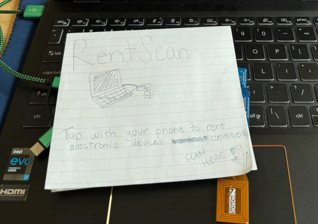 Our project, RentScan: Electronic Services, hopes to address the obstacles to accessing electronics. Our solution lets people visit any local department store to borrow essential devices like laptops needed for school or work. The rental process is extremely simple. Users just need their phone to scan a tag and reserve it for a certain usage time. It would be an improvement because it eliminates traditional paperwork and tedious checkout processes, which create obstacles to technology access. With the Near Field Detection tag, people can instantly reserve devices without waiting in lines to fill out forms, saving time. To start, it works by using an NFC (Near Field Communication) tag attached to each rentable device. When a user scans the tag with their phone, the tag sends a preconfigured NDEF (NFC Data Exchange Format) message containing information about the device. The NFC works in collaboration with Bluetooth Low Energy (BLE) to launch a rental request, which is then confirmed by a central BLE device that outputs a confirmation that the tag was scanned and rented out. The system handles rental logic and updates rental status in real time. This wireless integration simplifies the entire process and makes device access faster, more intuitive, and widely accessible. GitHub Repo Link: https://github.com/ariveram128/NFC-Rental-System