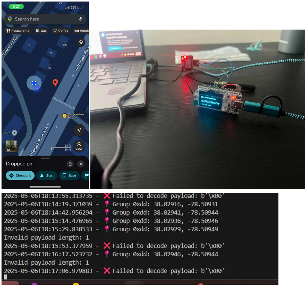 Losing an important and expensive piece of equipment through shipping and other ways has always been a problem. For our project we have decided to make a device that can track location through the current longitude and latitude of an object. Our wireless system is an improvement over normal LoRa because originally it doesn’t have any location detection abilities so we added a gps onto it. We connected the system to the The Things Network and sent a payload to it. The payload is then decoded through python in a 9 byte packet (1 byte for Group ID, 4 bytes for longitude, and 4 bytes for latitude). The coordinates are then saved in a csv file. One problem that we ran into though was that it needed to be outside so it could detect a few satellites probably due to the inferences of the building. {style=“text-align: justify;”}