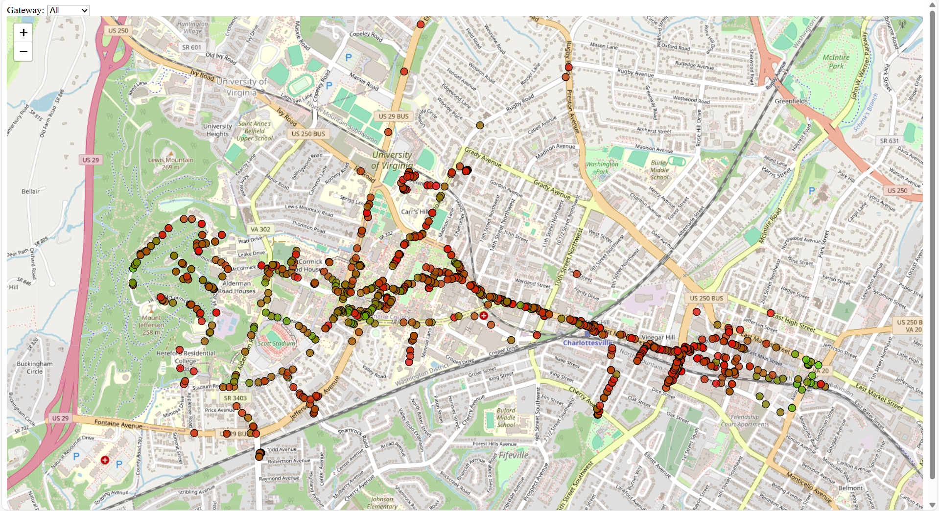 Some IoT devices move around and their location is important for readings that they involve. The simplest solution to knowing the location of these devices is to add a GPS to your IoT device, however there are many drawbacks to using GPS, such as increasing the cost per device by $5-10 and shortening battery life from years to months. Our solution to this problem uses LoRa gateways to cheaply determine the location of the device without using any device battery or much more cost. We accomplish this by using the RSSI values of at least 2 gateways and training a machine learning algorithm using these values and the location of the gateways to determine the location of the device. {style=“text-align: justify;”}