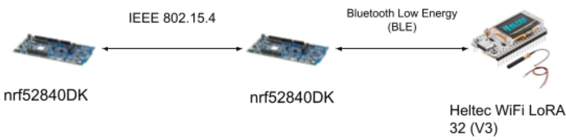 The goal of this project is to build a bridge device that can act as a translator between two separate IoT devices: one device that supports IEEE 802.15.4 but not BLE, and another that supports BLE but not IEEE 802.15.4. Many real world IoT and embedded devices will use just one or maybe two wireless protocols, but not a plethora of protocols like the nRF development boards. If you are working with devices or sensors that someone else built, you likely will not have any control over the wireless protocols available. If two devices use incompatible protocols, there is no way for them to directly communicate. That is where the IEEE 802.15.4 to BLE Bidirectional Bridge comes in handy as it acts as an intermediary that can receive, translate, and transmit packets back and forth between incompatible devices. The bridge works by first utilizing packet burst between the two NRF boards. Then, the 2nd nRF board acts as a central, and the Heltec collecting the temperature value acts as a peripheral. By pressing the button on the first nRF board, the temperature value gathered by the Heltec board is relayed through the 2nd nrF board back into the first nRF board. {style=“text-align: justify;”}