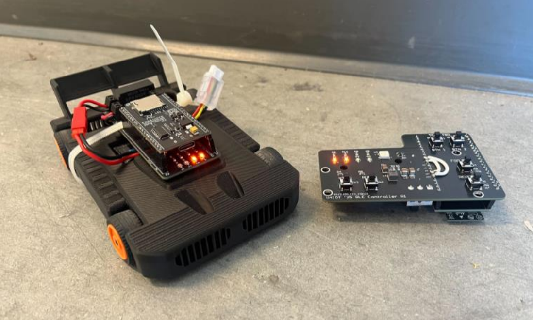 Our project explores the use of Bluetooth Low Energy (BLE) for wireless control of small robotic vehicles in short-range applications. While traditional radio-frequency (RF) control offers greater range, it typically requires dedicated hardware and is often limited to unidirectional communication. By integrating BLE, we were able to use off-the-shelf ESP32-based microcontroller boards on both the car and controller, eliminating the need for specialized radio transceivers and enabling bidirectional communication. Both the vehicle and the handheld controller use ESP32 modules to transmit and receive Bluetooth messages. Additionally, each device is equipped with Neopixel RGB LEDs, which provide status indicators and aesthetic underglow lighting. The vehicle streams live video from a browser-accessible web server, allowing real-time visual feedback. Propulsion is provided by two independent rear hub motors, each controlled by a Texas Instruments DRV8962DDWR dual H-bridge motor driver. Pulse-width modulation (PWM) is used to achieve variable speed control in both forward and reverse directions. The car employs skid steering, enabling full directional control without the need for a mechanical steering rack. {style=“text-align: justify;”}