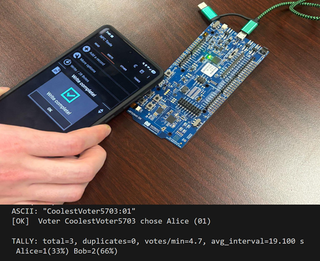 Paper-based ballots are slow, error-prone, and require manual transport and counting, leading to delays of days or even weeks before results can be counted. Our NFC+BLE system enables anonymous, in-person voting by using NFC tags. Deployment requires no existing infrastructure, just off-the-shelf NFC tags and a battery-powered BLE central, making pop-up polling sites or remote voting easy to set up and use. Voters simply tap their NFC-enabled phone to write a short “ID:choice” text record on the tag, which immediately notifies and sends to the central node via BLE with no permanent data being stored on the tag. Our central then parses, filters, tallies, and logs each vote to the console in real time. This requires no experience/training, simple and easy for the voter, and delivers near-instant, verifiable results while preserving anonymity. {style=“text-align: justify;”}